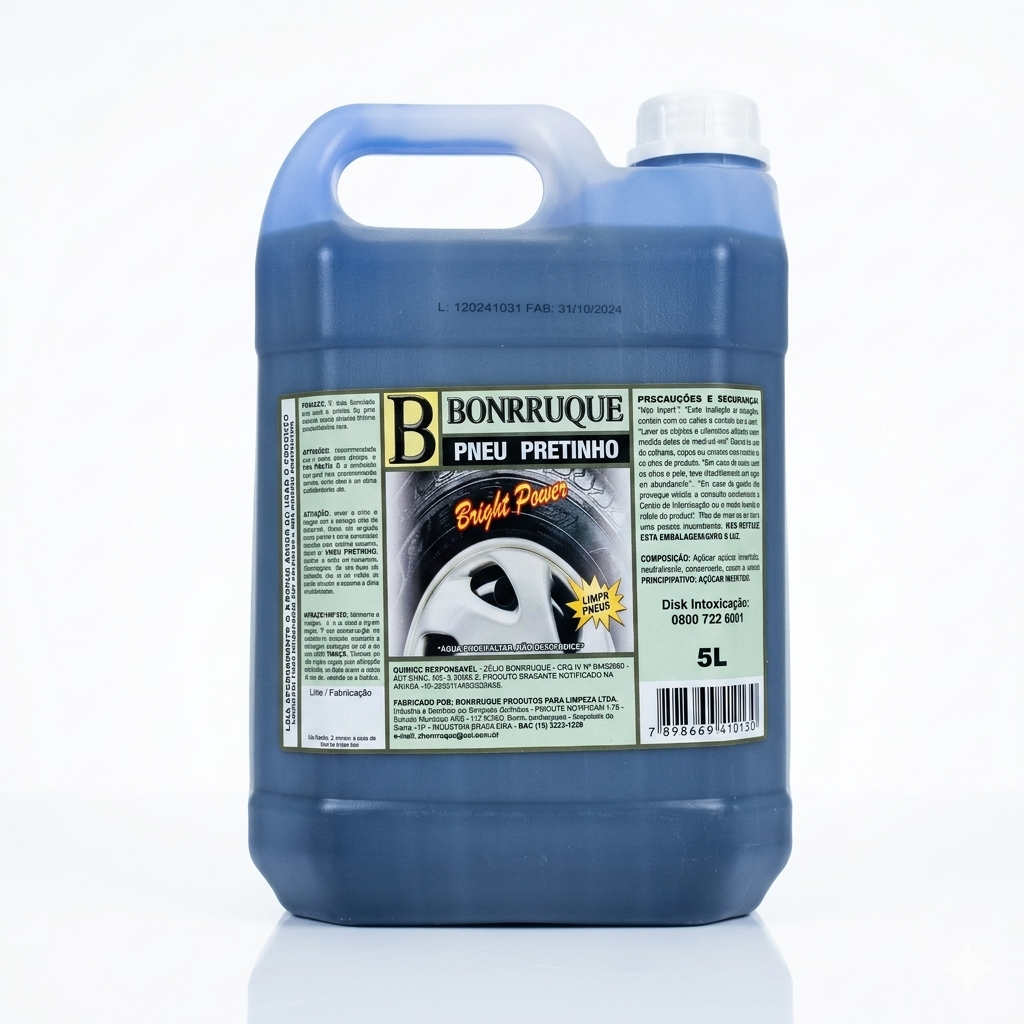 O Pneu Pretinho 5L Bonrruque é formulado para uso pronto, oferecendo uma solução econômica e de alta performance para manter seus pneus com um visual impecável. Com uma embalagem generosa de 5 litros, este produto é ideal para quem busca rendimento e eficiência, proporcionando um brilho intenso e uma proteção duradoura para os pneus.